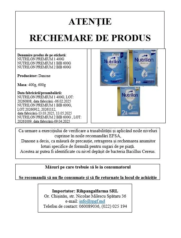 Danone a anunțat retragerea preventivă a anumitor loturi de formule de lapte praf pentru sugari în urma unei verificări a conformității cu standardele Autorității Europene pentru Siguranța Alimentară (EFSA), transmite sursa.