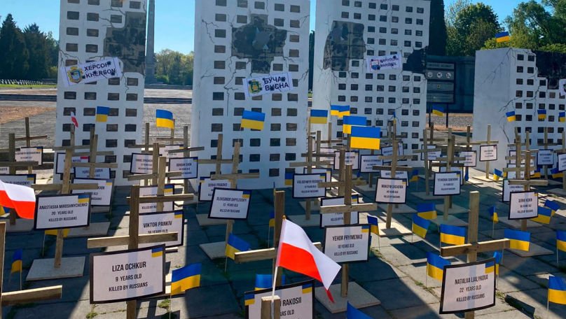 În fața cimitirului-mausoleu al soldaților sovietici din Varșovia, activiștii Euromaidan-Varșovia au creat o instalație dedicată orașelor distruse din Ucraina și victimelor terorii rusești.