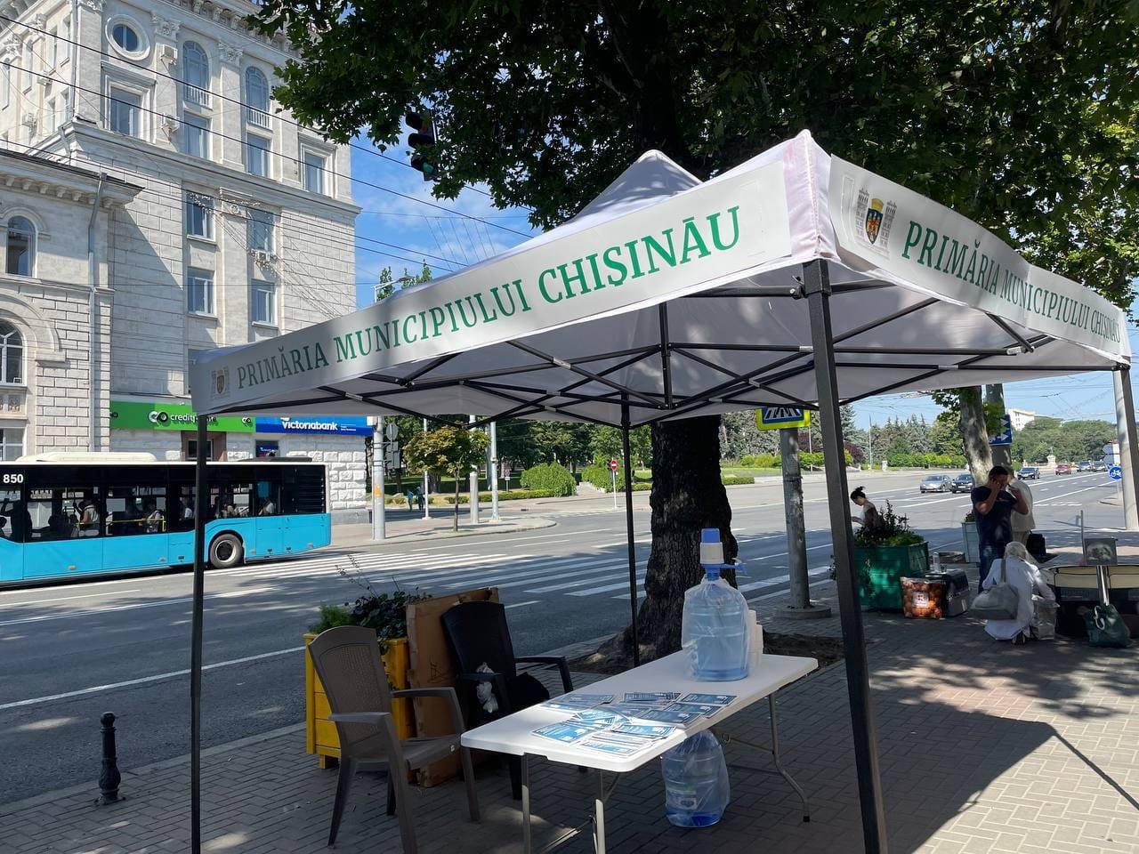 Primăria Capitalei oferă trecătorilor apă și ziare în culorile partidului actualului primar