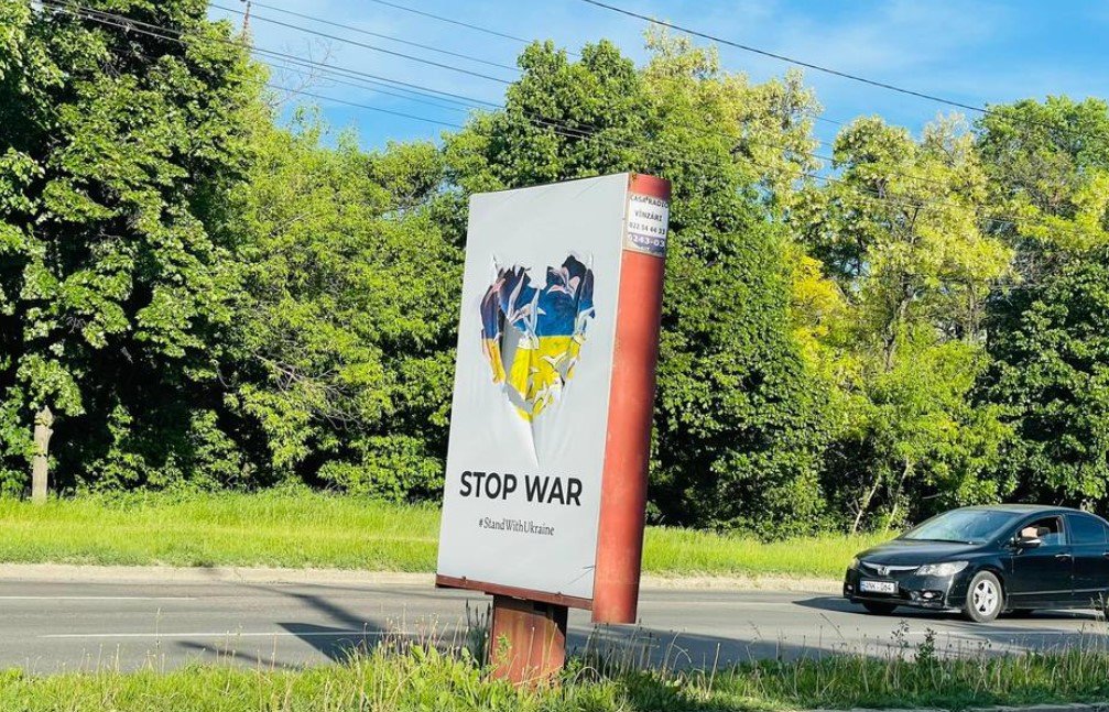 FOTO: Bannerele de pe Viaduct cu mesaj împotriva războiului din Ucraina, vandalizate cu litera V, simbol al agresiunii ruse